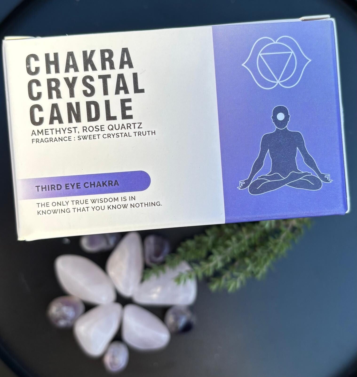 Breid je intuïtie en innerlijke wijsheid uit met onze Third Eye Chakra Crystal Candle. Verrijkt met Amethist en Rozenkwarts, stemt het af op de essentie van het Derde Oog Chakra.