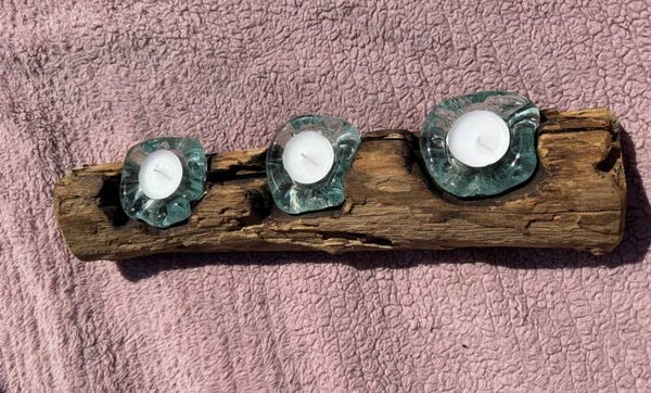 Handgemaakt & Authentiek — Deze kandelaar is handgeblazen van gerecycled glas en geplaatst op een stuk Gamal-wortelhout uit Bali. Door het hete glas direct op het hout te laten uitharden ontstaat een perfecte, natuurlijke pasvorm.