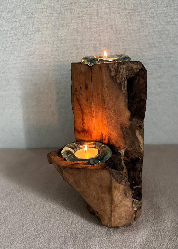 Gesmolten Glas op Hout - Dubbele Kaarshouder