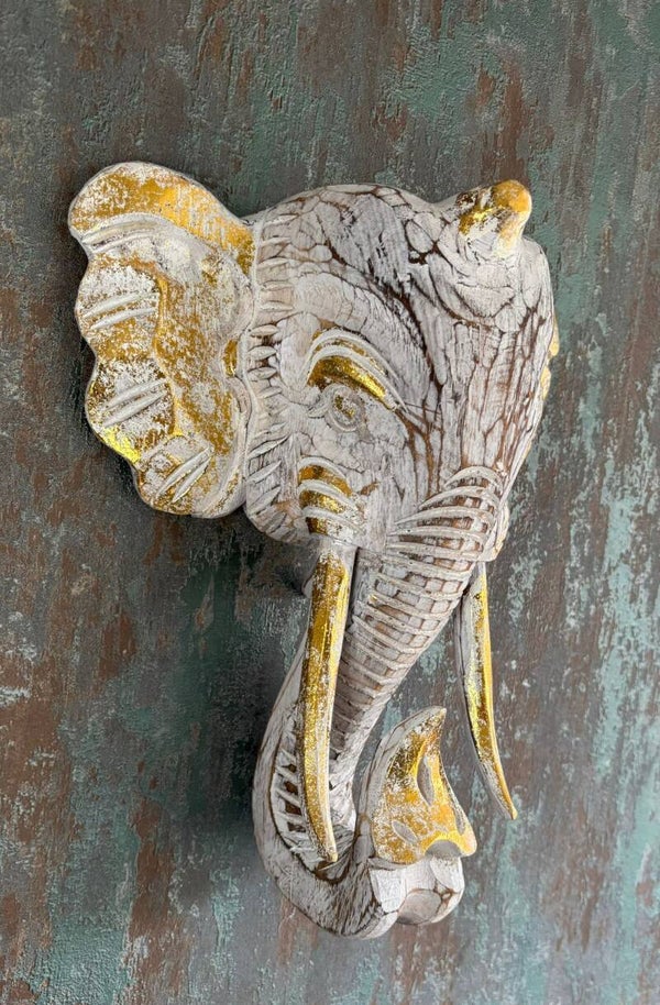 - Ontwerp: Gedetailleerd gesneden olifantenkop met een unieke whitewash afwerking die de gouden accenten prachtig complementeert