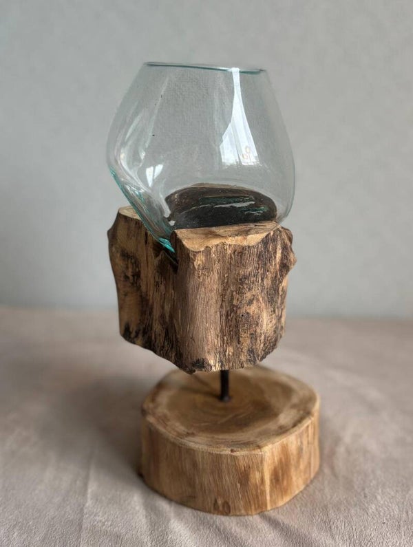 Met de hand vervaardigd in Bali van gerecycled glas en Balinees Gamal-hout, brengt dit prachtige Gesmolten Glas op hout met standaard - Medium kom het beste van twee werelden samen: natuurlijk en door de mens gemaakt; aards en chic; praktisch en spiritueel. Het glas is met de hand geblazen en terwijl het nog heet is, wordt het ontspannen over een stuk Gamal-wortel, het glas hardt dan uit tot de vorm van het hout en zorgt voor een perfecte pasvorm. ⁹