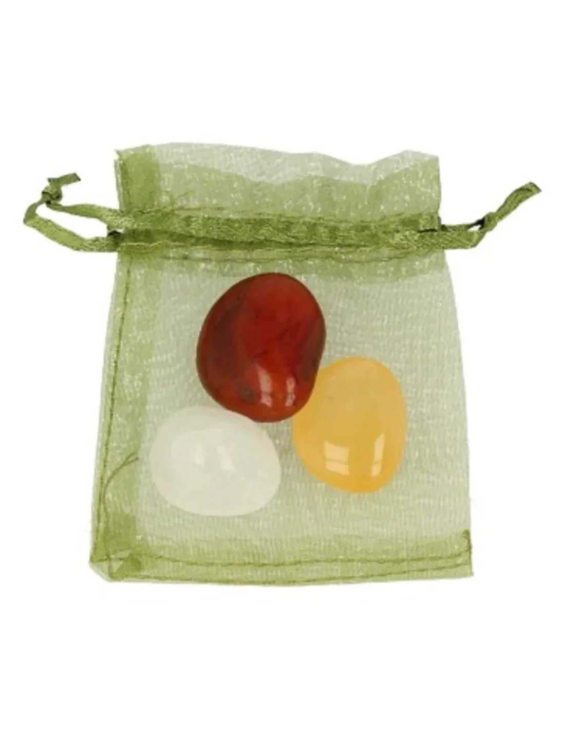 Gezondheid edelstenen setje met daarin 3 trommelsteentjes zijn Bergkristal, Calciet en Carneool met een handig kaartje met uitleg.