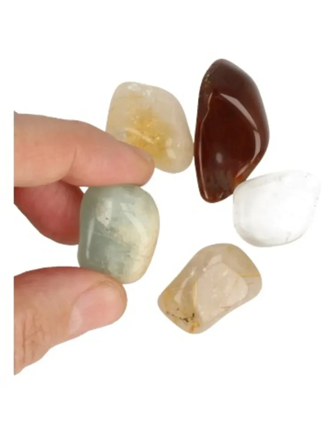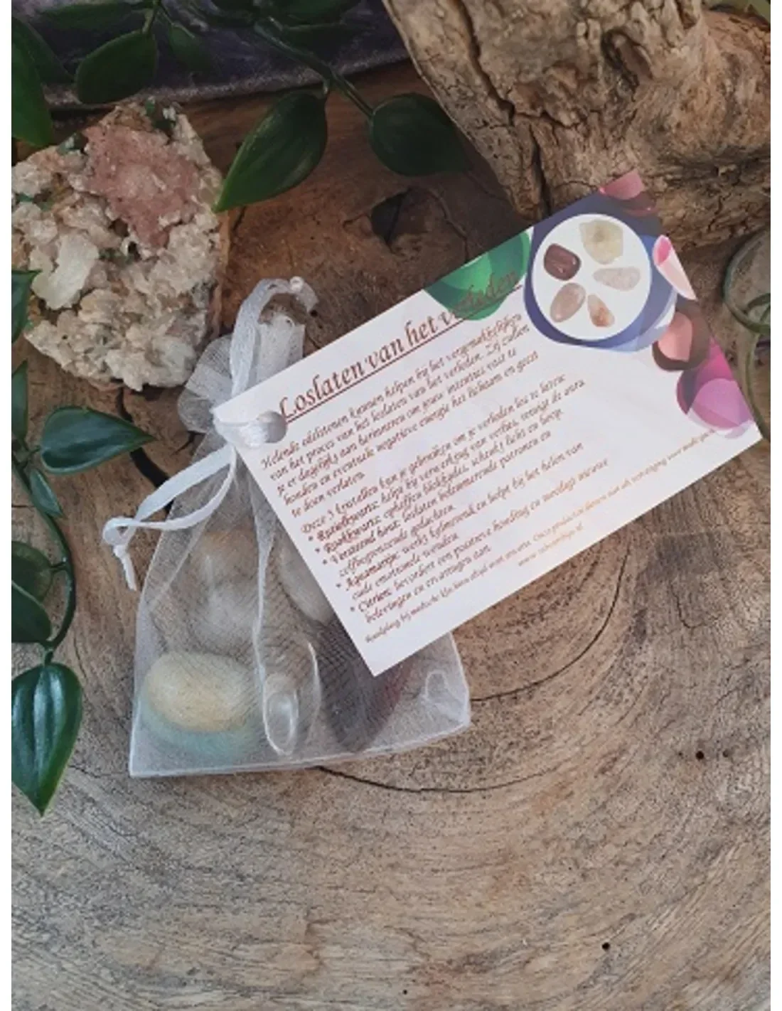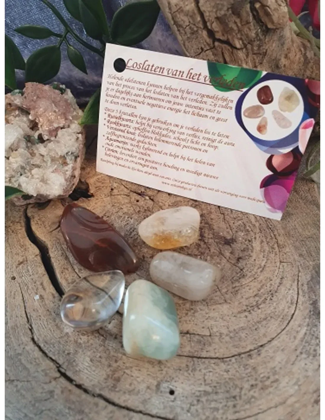 Loslaten van het verleden - edelsteen setje, bestaande uit Rutielkwarts, Rookkwarts, Citrien (verhit), Aquamarijn en Versteend hout.