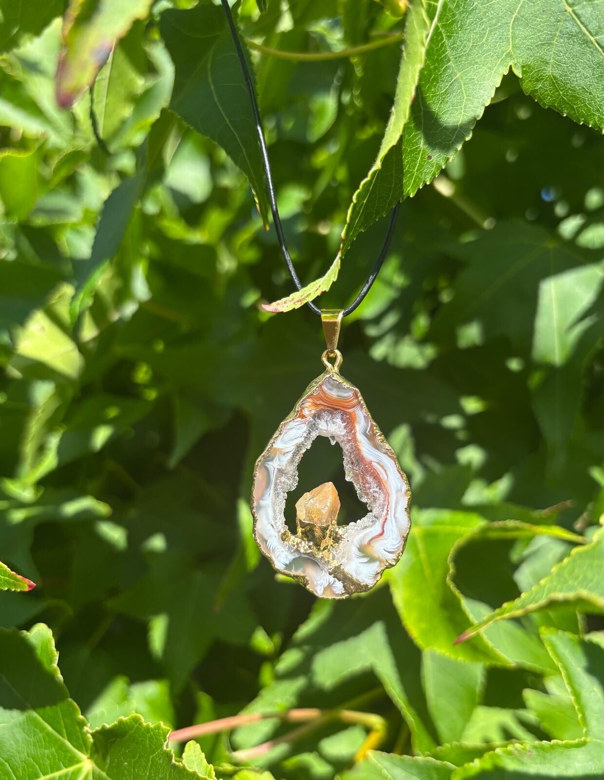 De Agaat met Citrien Hanger is een sieraad van circa 5 x 3 cm, bevestigd aan een leren koord. Deze hanger combineert de aardende energie van Agaat met de activerende kracht van verhitte Citrien, wat zorgt voor een harmonieuze balans tussen stabiliteit en vitaliteit.