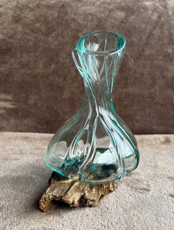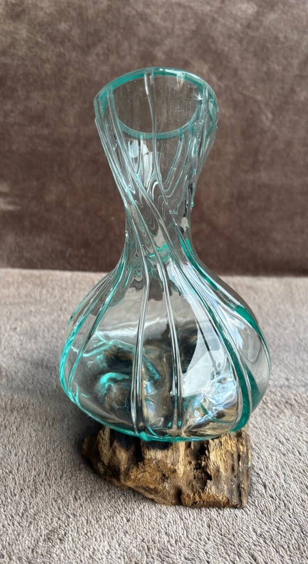 Deze Gesmolten Glas Luxe Mini Karaf op Hout toont Balinees vakmanschap op zijn meest verfijnde wijze.