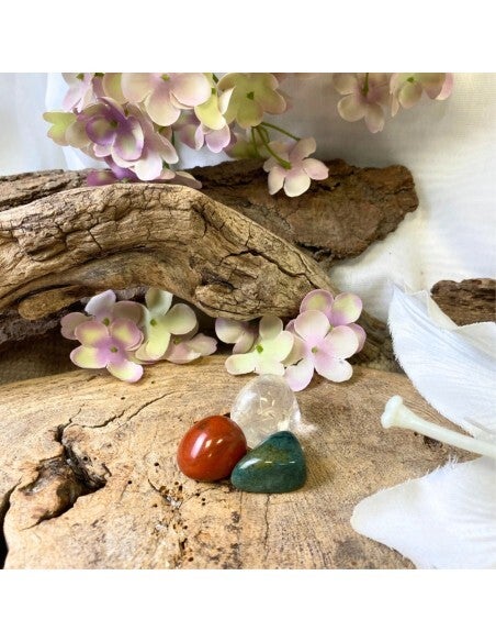 Bergkristal staat bekend als een krachtige reiniger en versterker van energie. Het brengt helderheid van geest en versterkt de werking van andere stenen. Jaspis rood bevordert uithoudingsvermogen, moed en doorzettingsvermogen. Heliotroop (bloedsteen) werkt aardend en beschermend, en stimuleert het zelfvertrouwen. Samen zorgen deze stenen voor balans, vitaliteit en een verhoogde energiecirculatie.