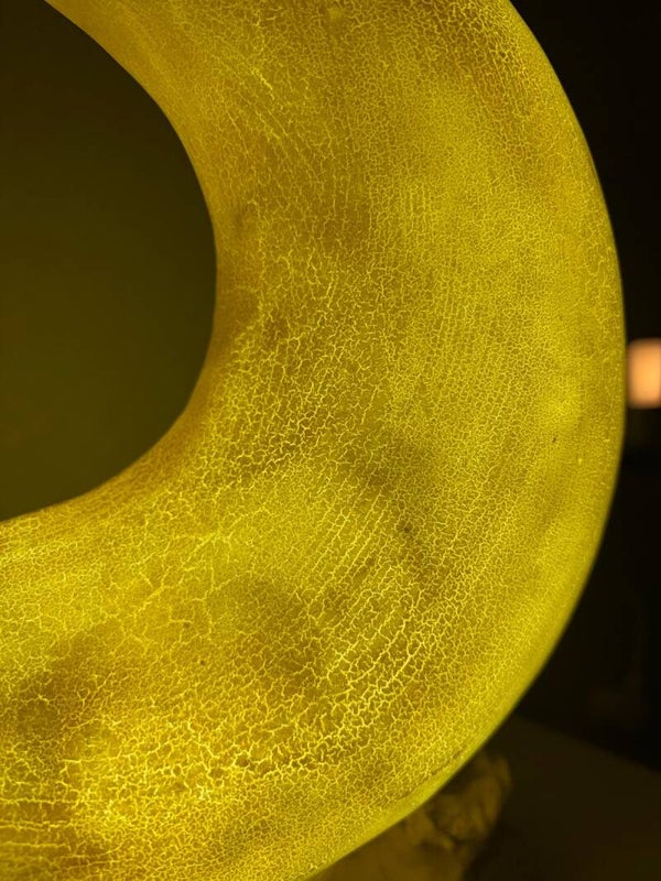 Deze lamp verspreidt een zachte, gouden gloed die een ruimte direct warmte geeft. De Crackle Halvemaan kap heeft een vloeiende, sculpturale vorm met een subtiele crackle-afwerking die het licht prachtig vangt. Wanneer de lamp aanstaat, straalt de gele tint rustig en sfeervol, zonder de ruimte te overheersen.